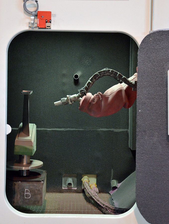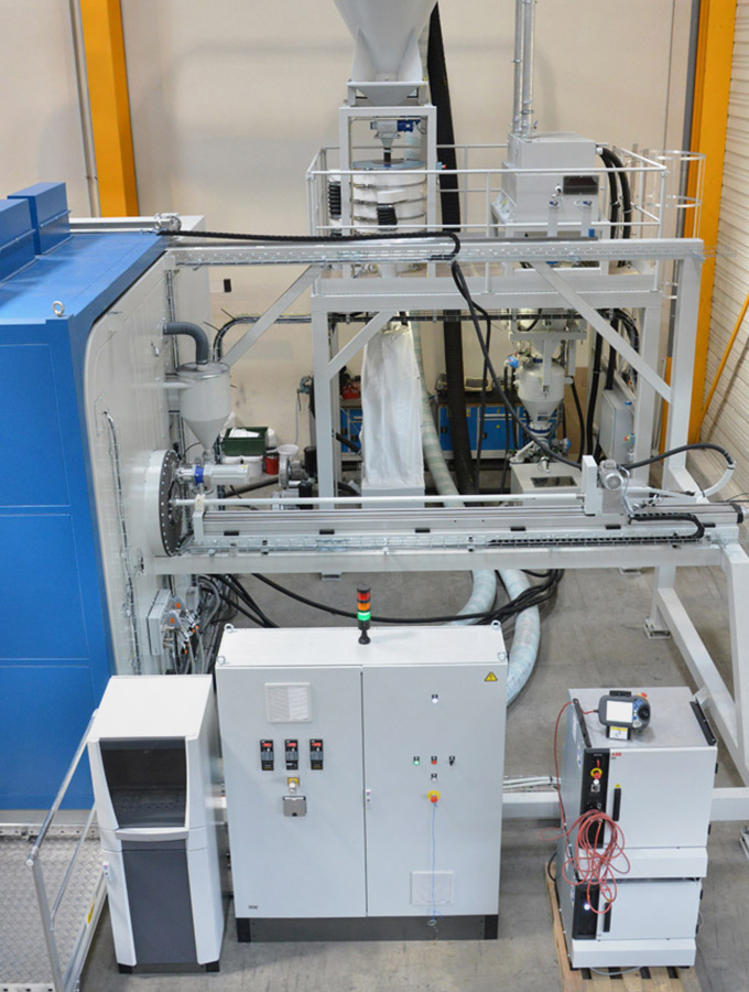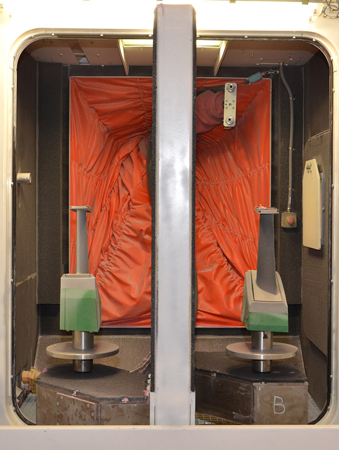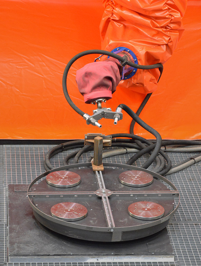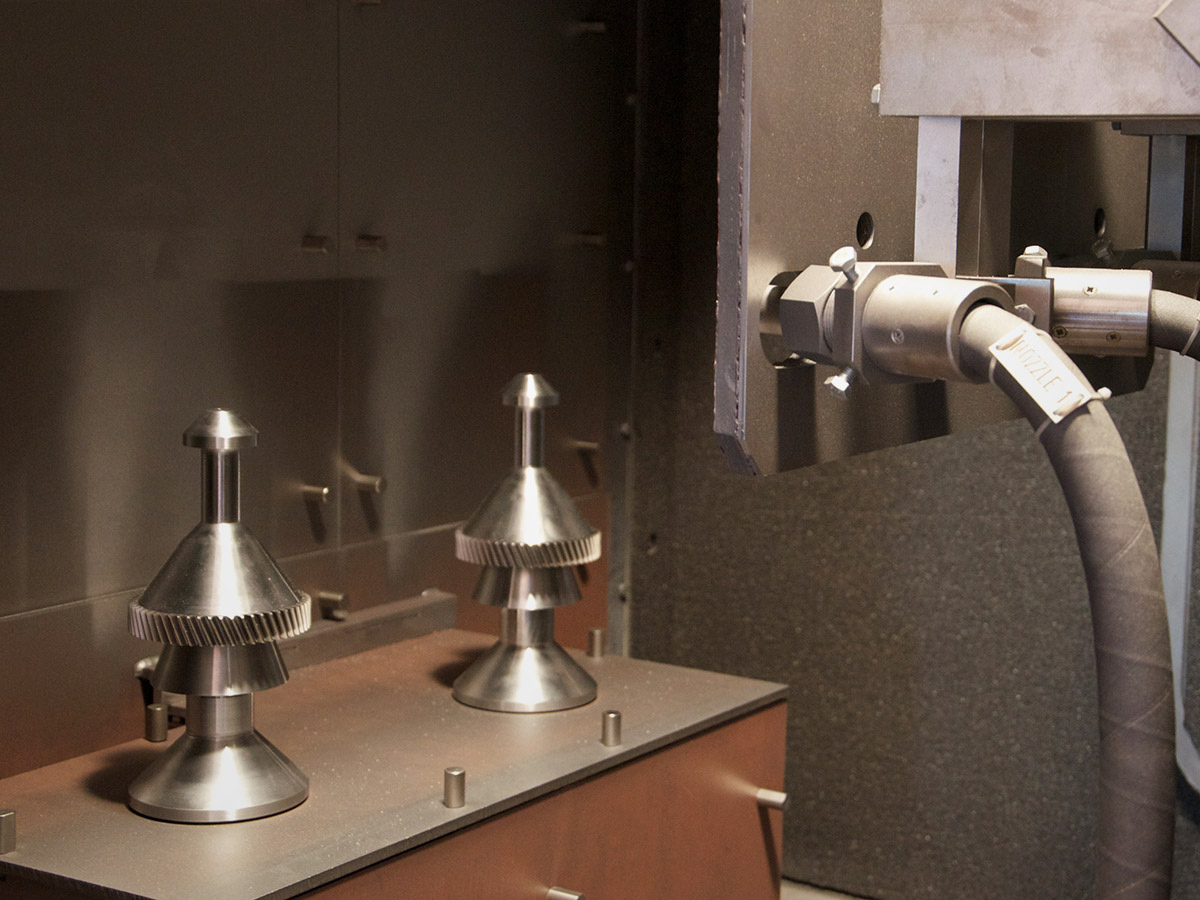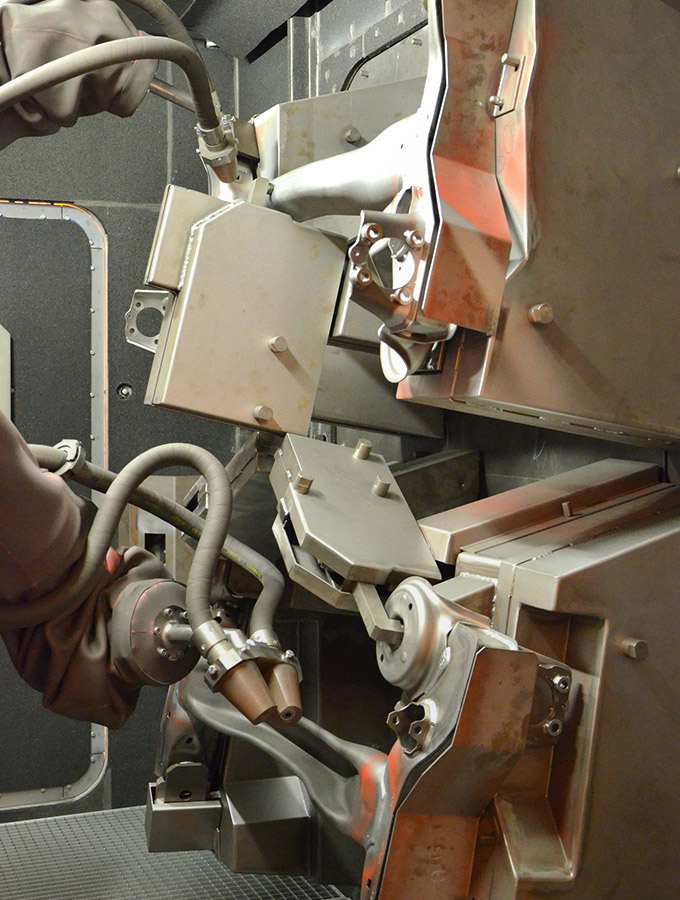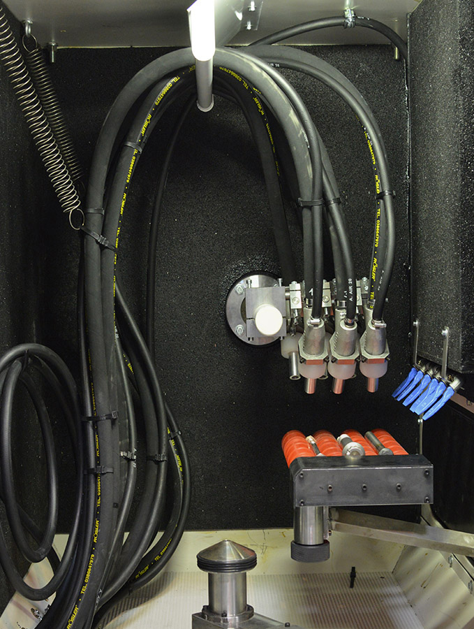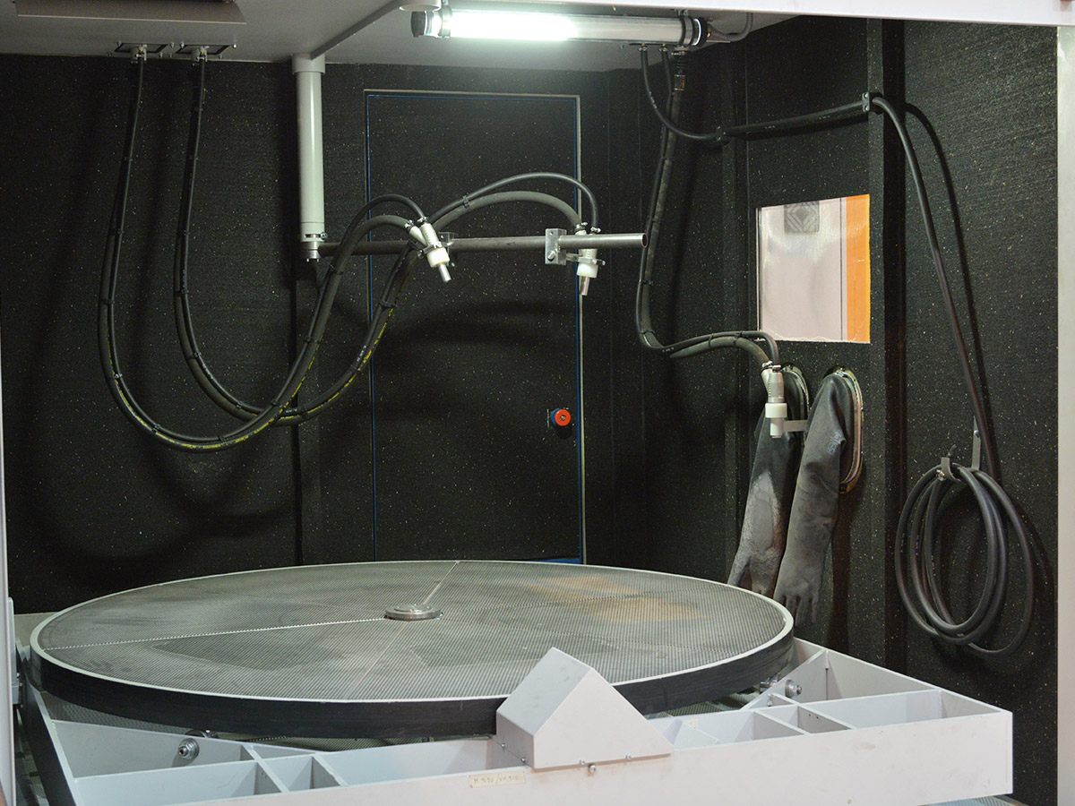 Optional interior blast lances on the roof of the swivel table installation also enable interior blasting of cylindrical components, such as drive shafts.