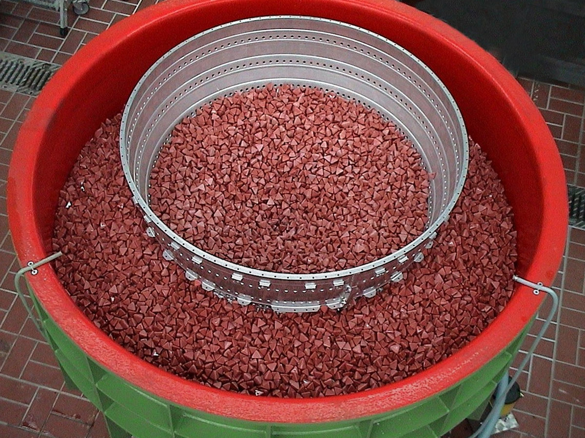Using these highly automated vibratory grinding systems, specific work piece geometries can be processed in order to achieve defined edge rounding on turbine components, for example. Parts that are not to be machined are excluded. The robot selectively guides the work piece in a rotating work container.