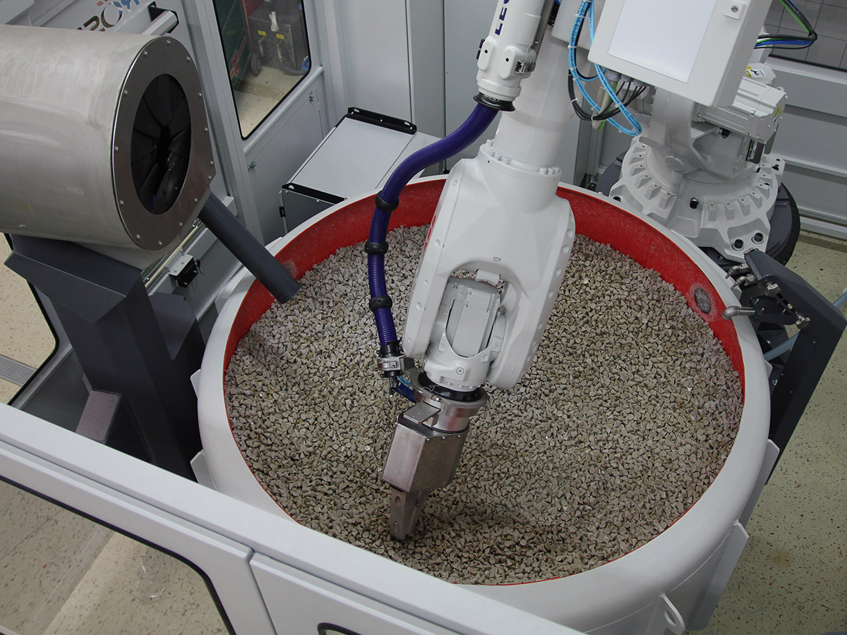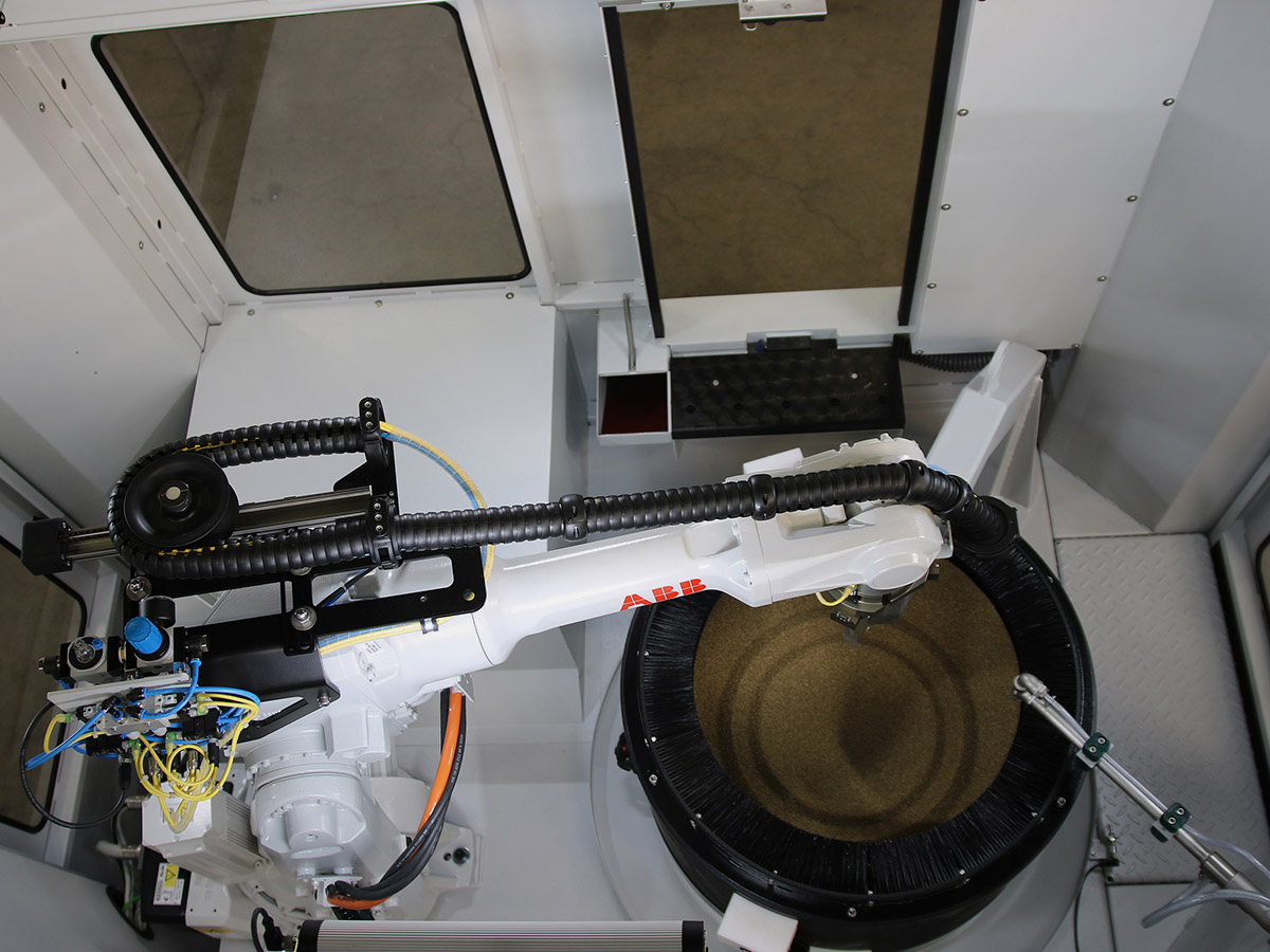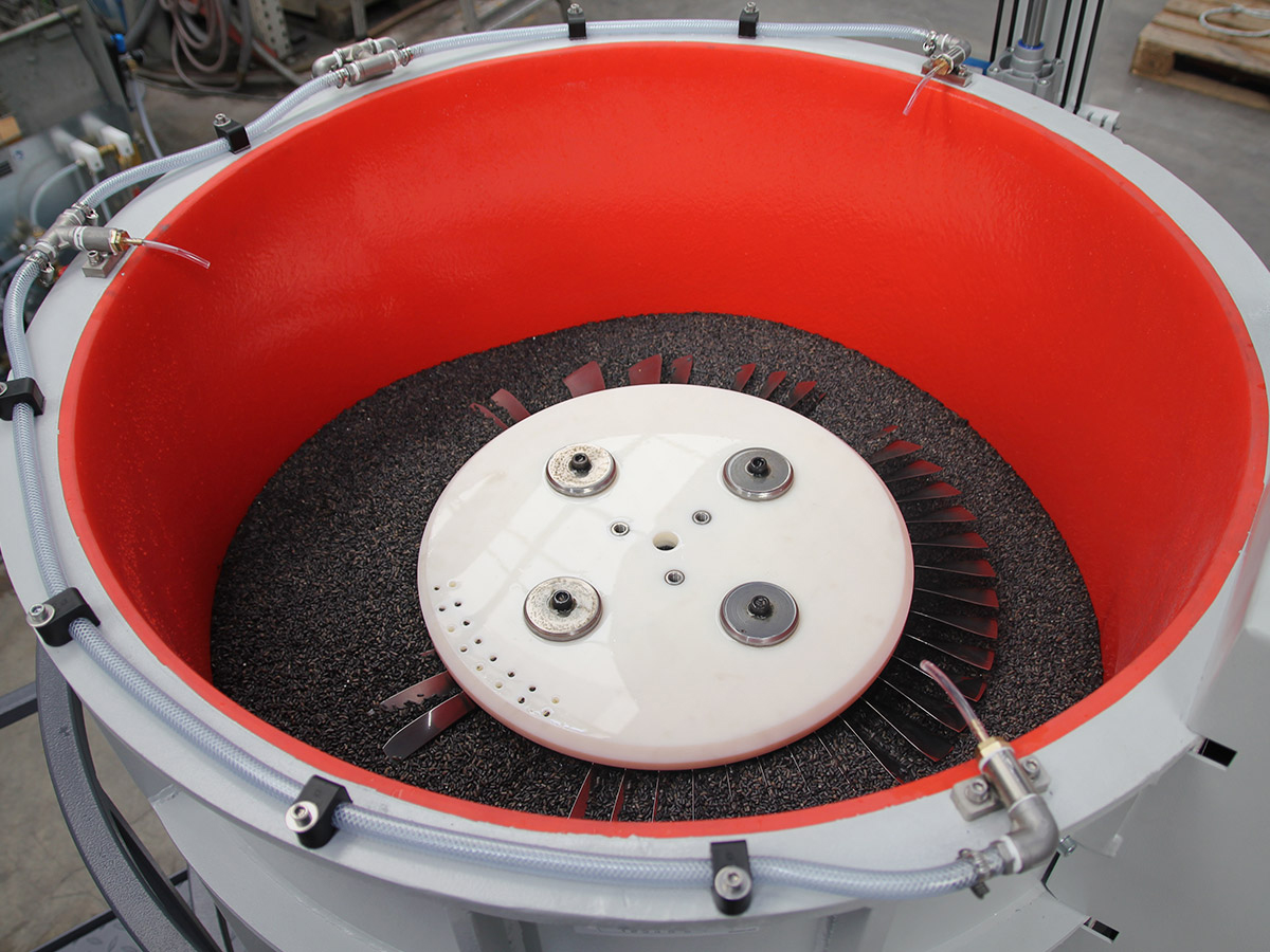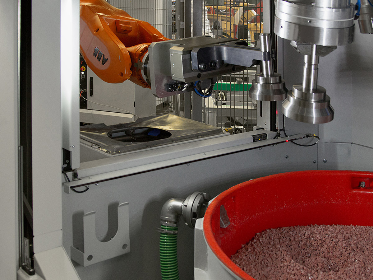 These systems are used for machining turbine components, smaller aluminum components following CNC processing, diecast components or other machine-produced work pieces made of varying materials. The work pieces are machined in bulk.